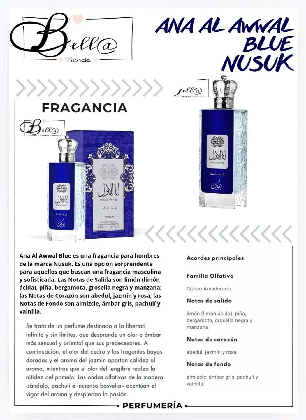 Ana Al Awwal Blue es una fragancia para hombres de la marca Nusuk. Es una opción sorprendente para aquellos que buscan una fragancia masculina y sofisticada.