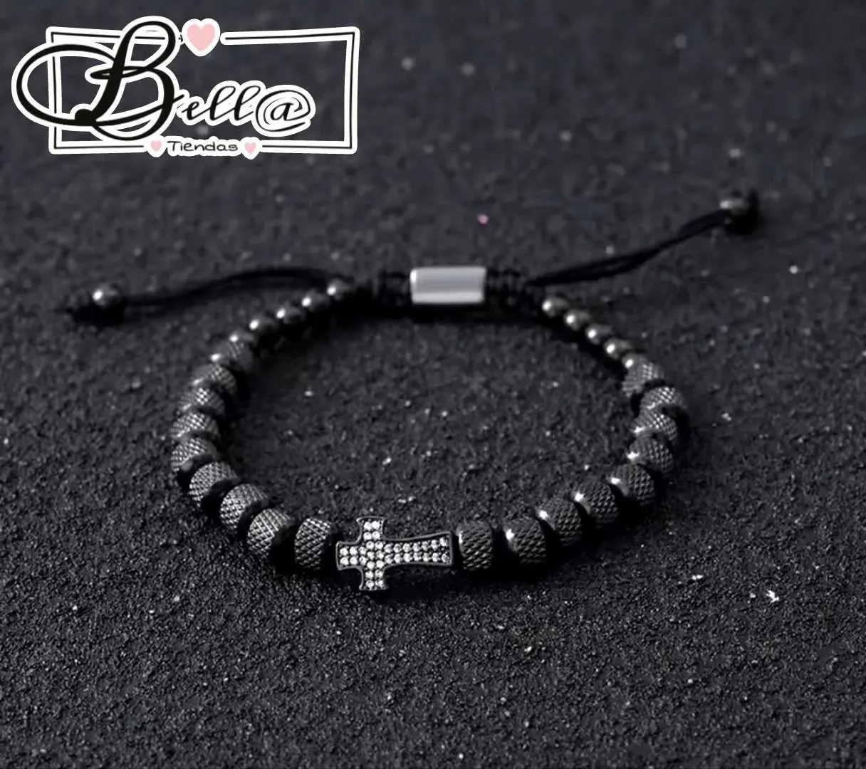 Pulsera de Cuentas Negras Cruz con Pedrería 💎🖤