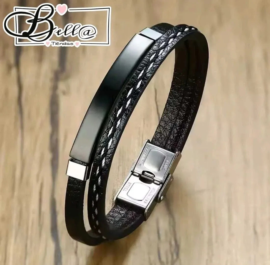 Pulsera de Cuero Doble Placa Fina Negra 🖤