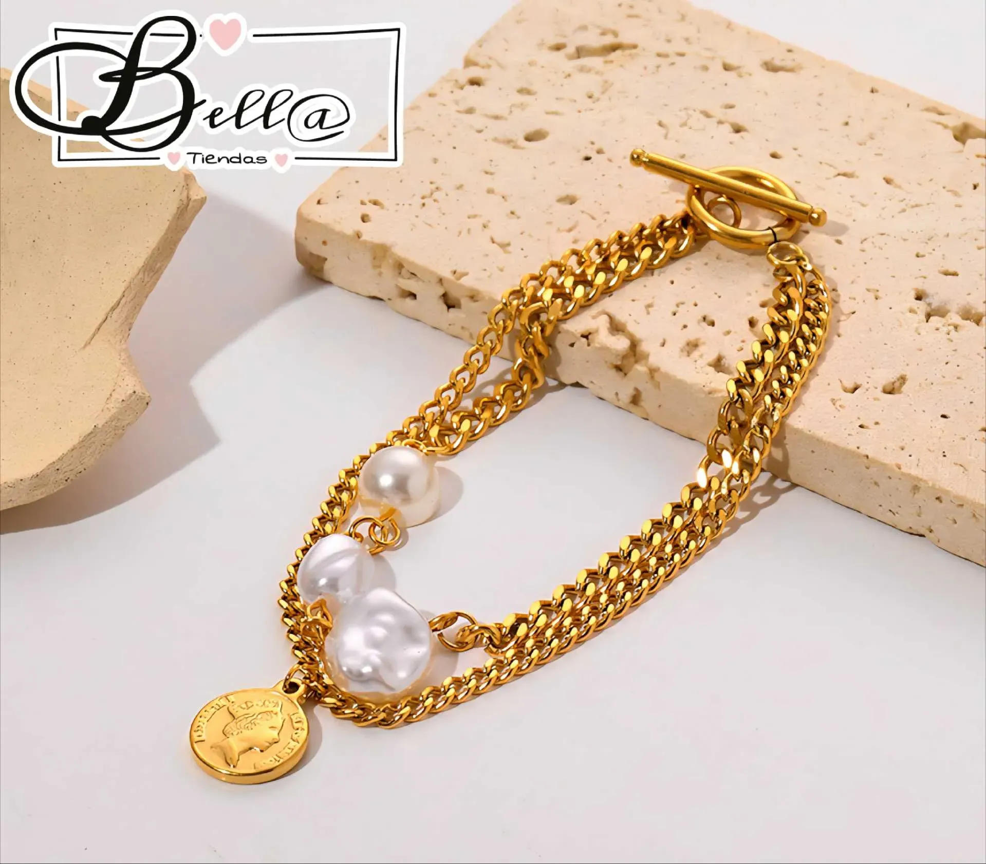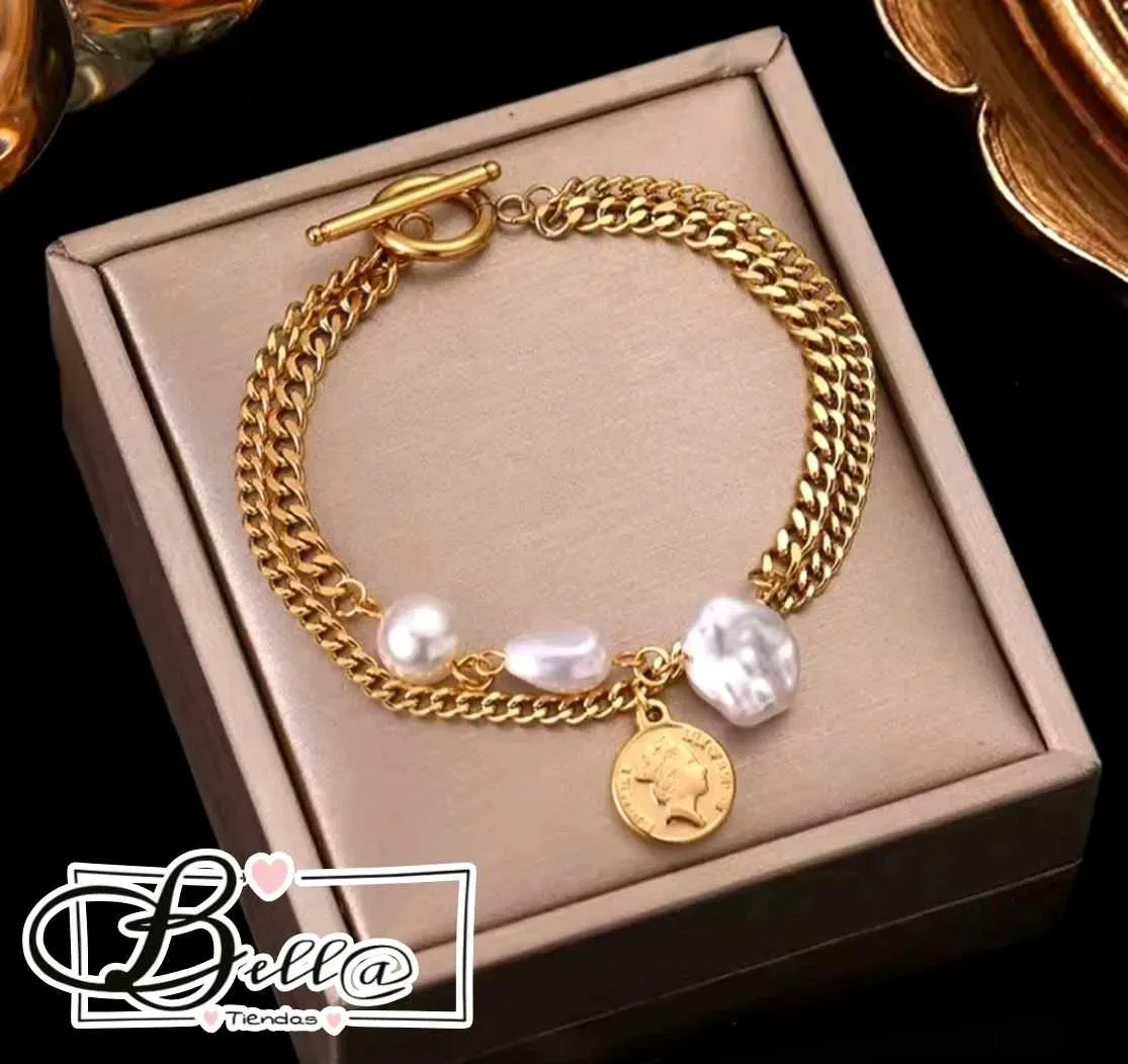 Pulsera Doble dijes Perlas y Moneda ⚪️🪙✨️
