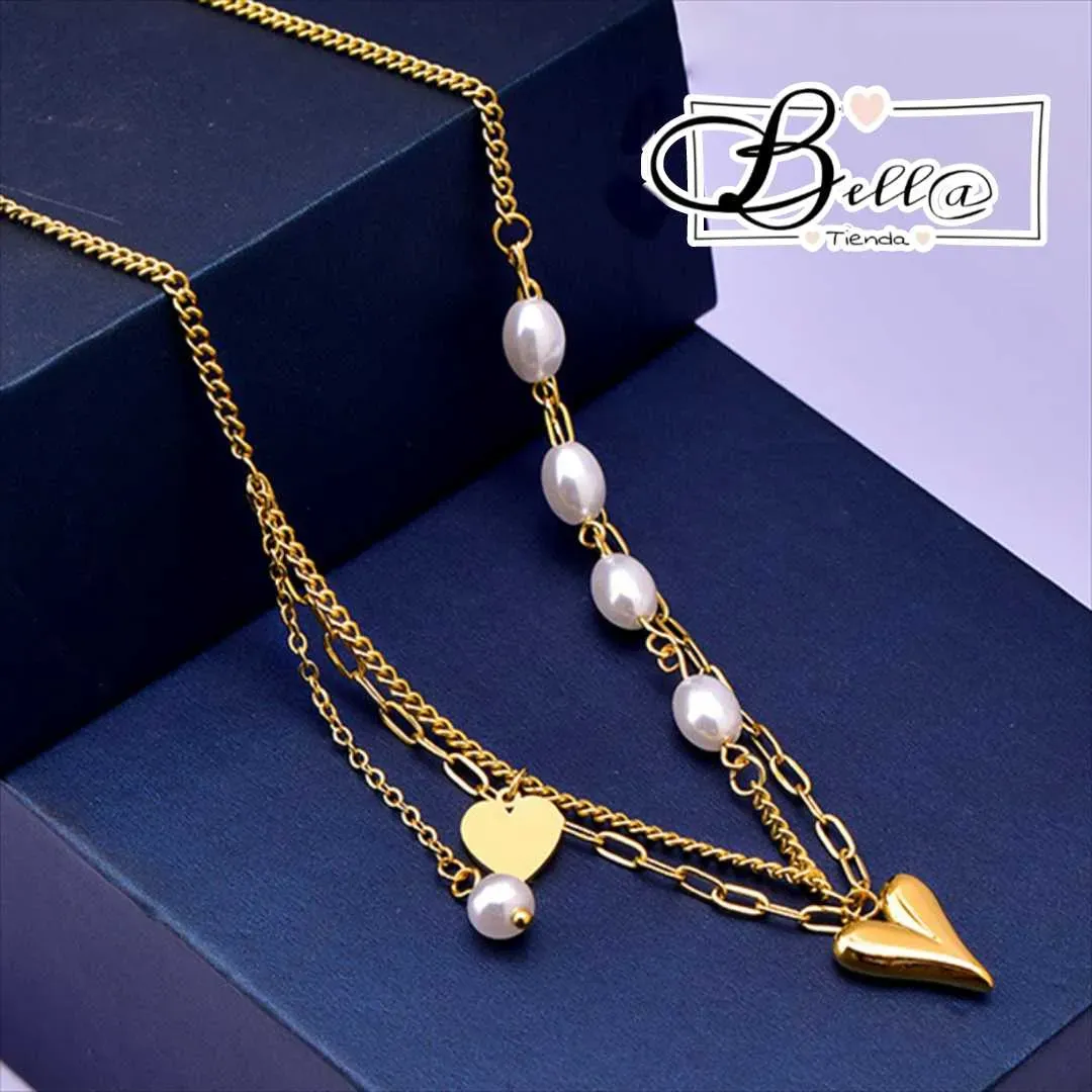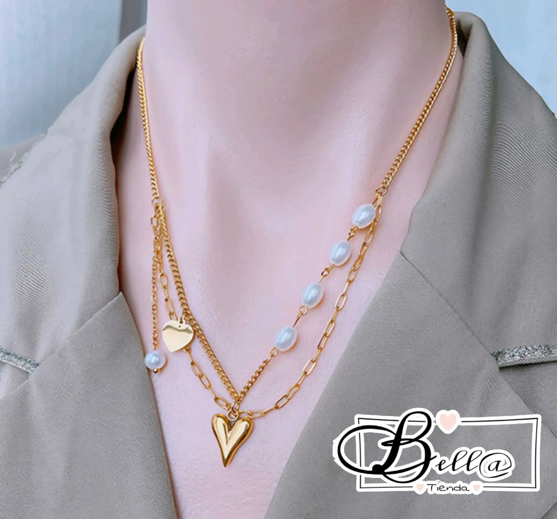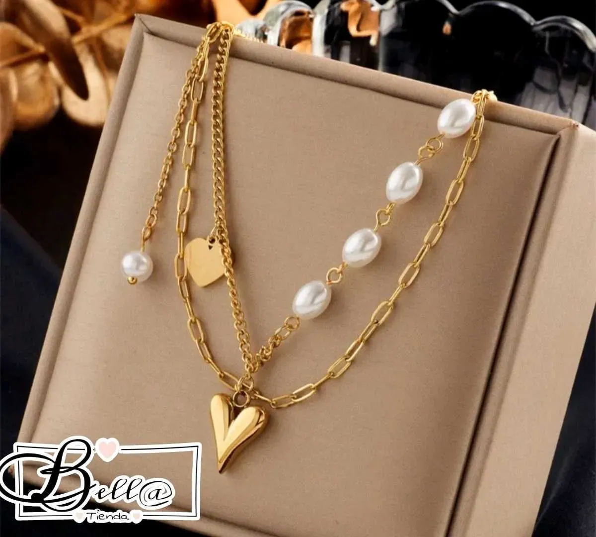 Collar Corazón Alargado con Perlas 💛⚪️✨️