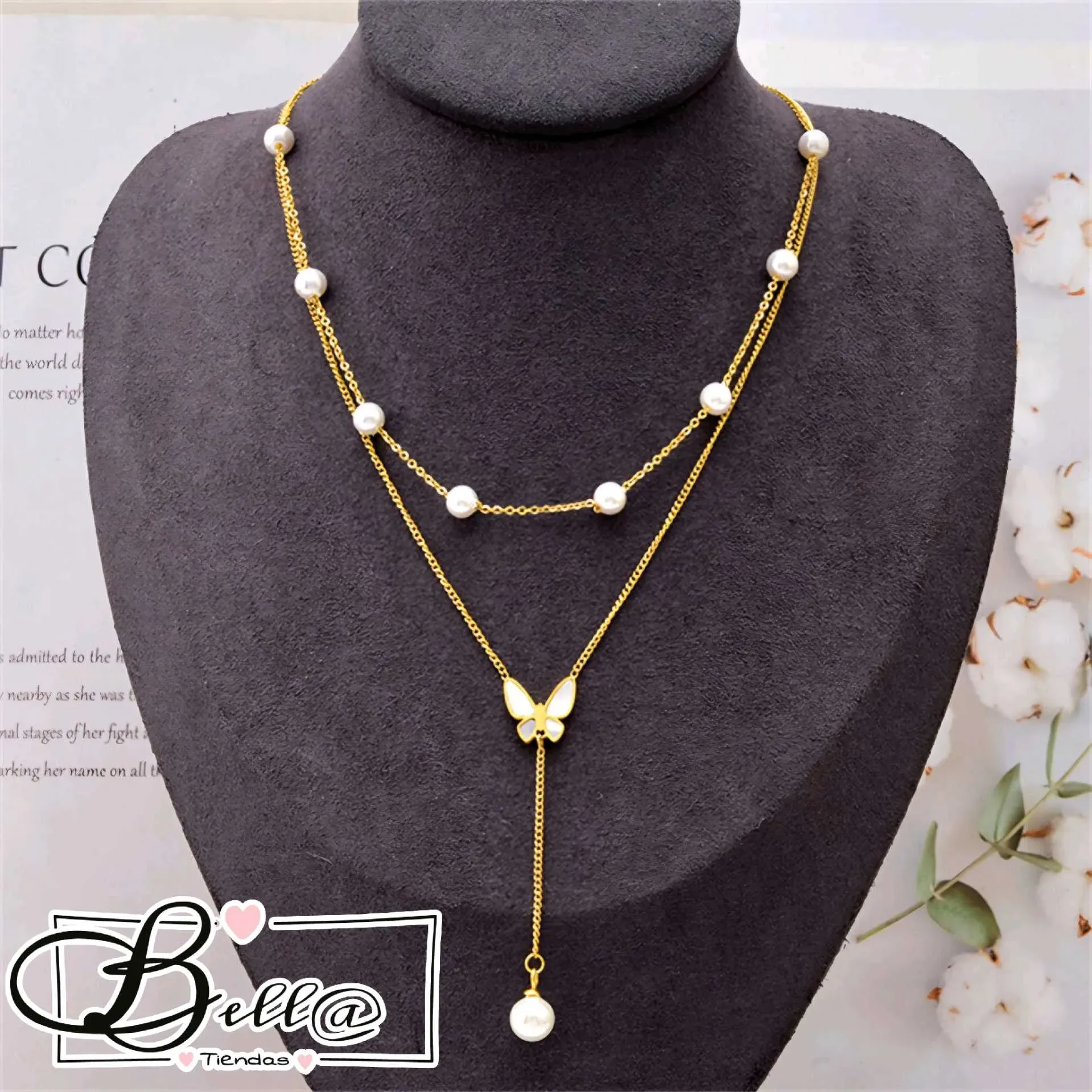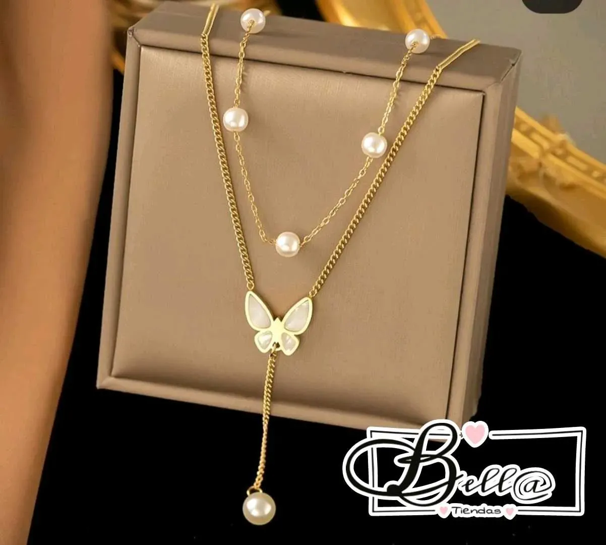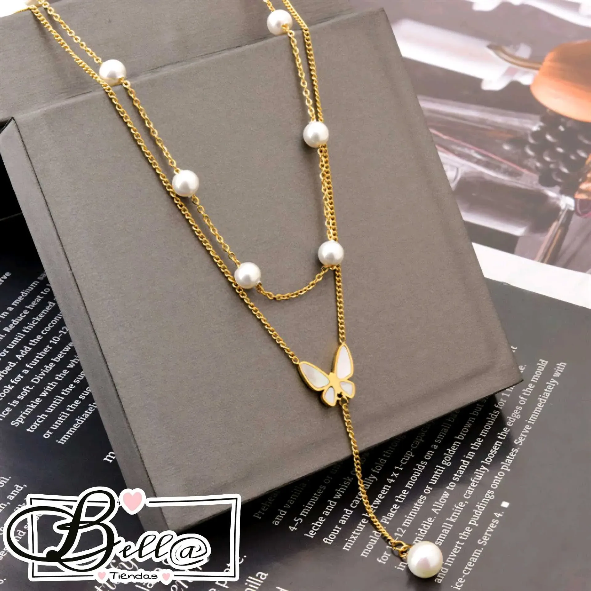 Collar Doble dije Mariposa y Perlas 🦋⚪️✨️