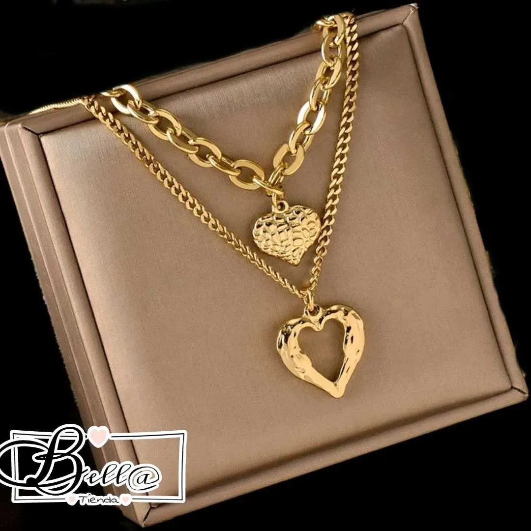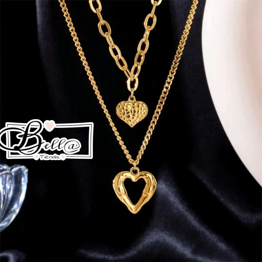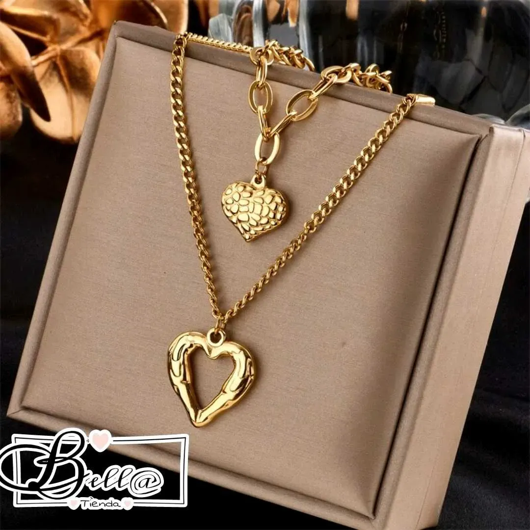 Collar Doble con Tejido Grueso y dijes de Corazón 💛