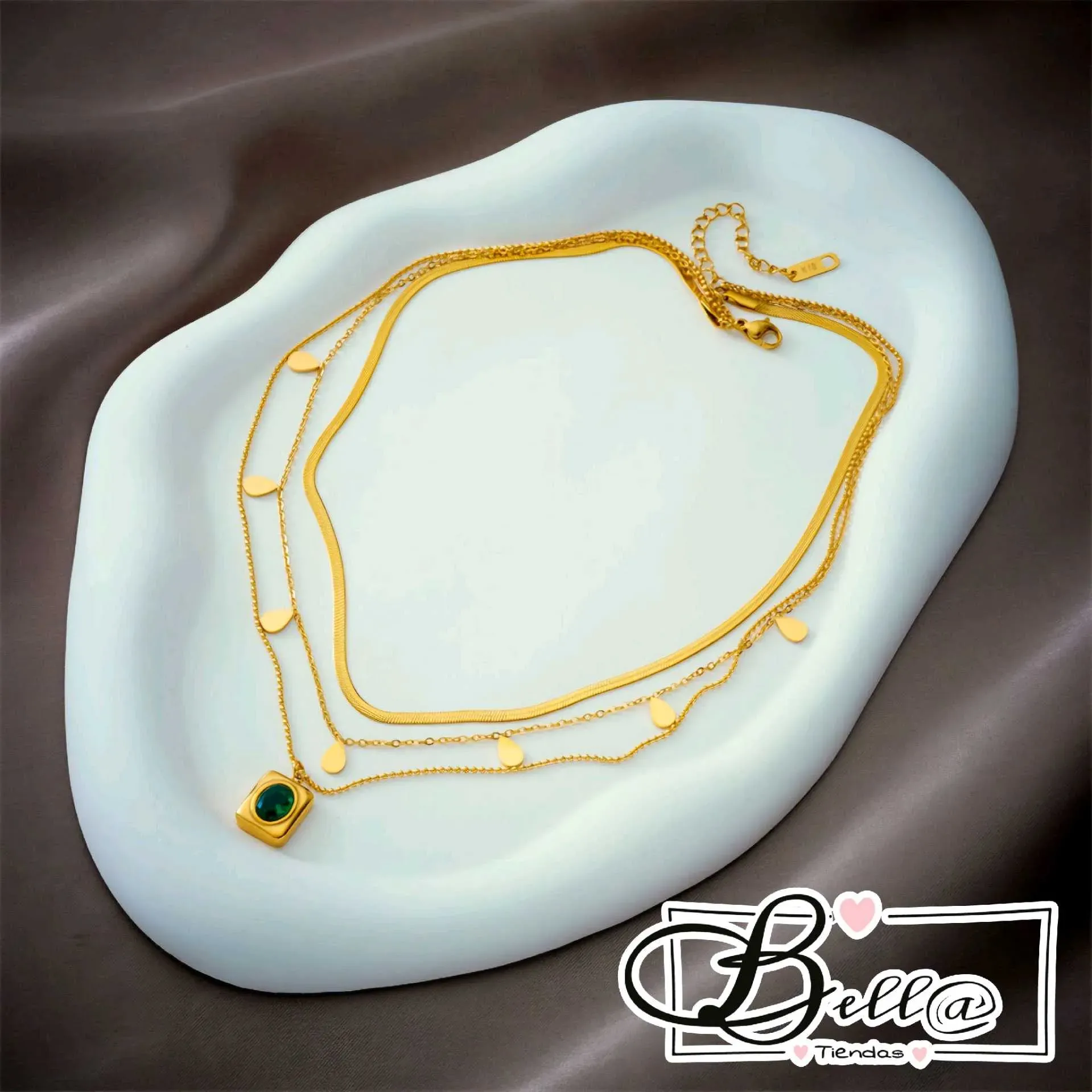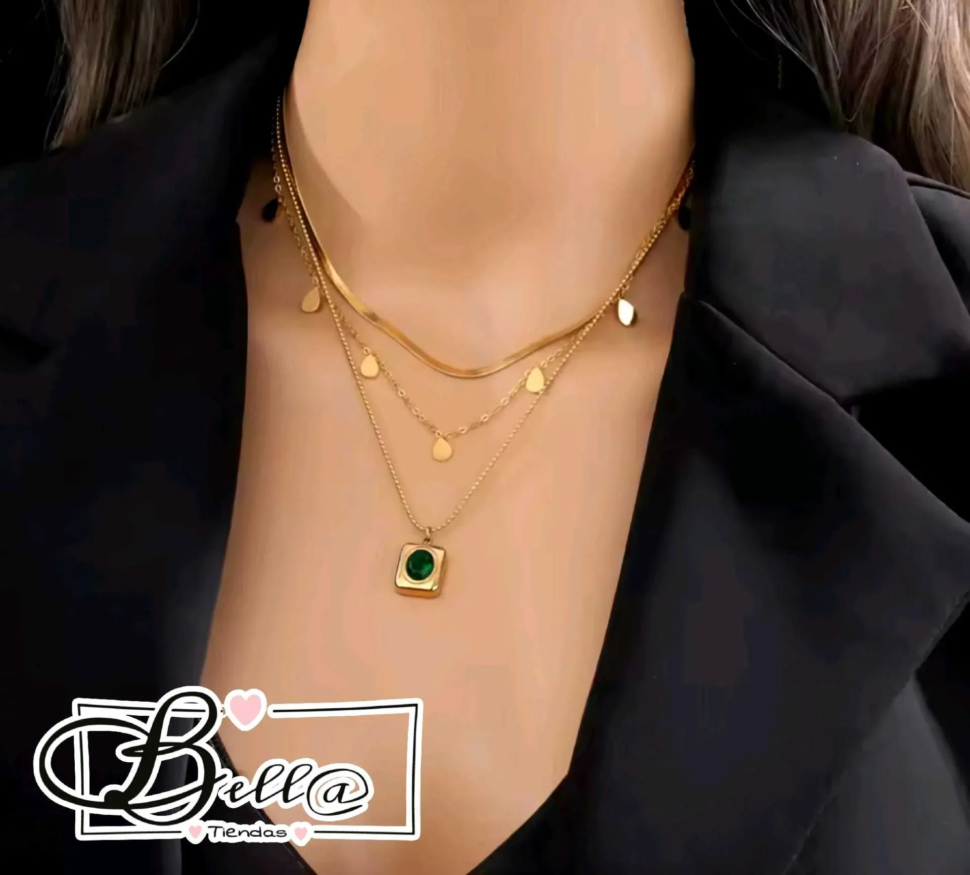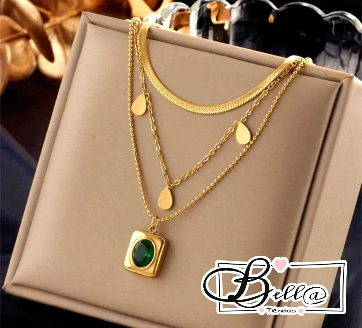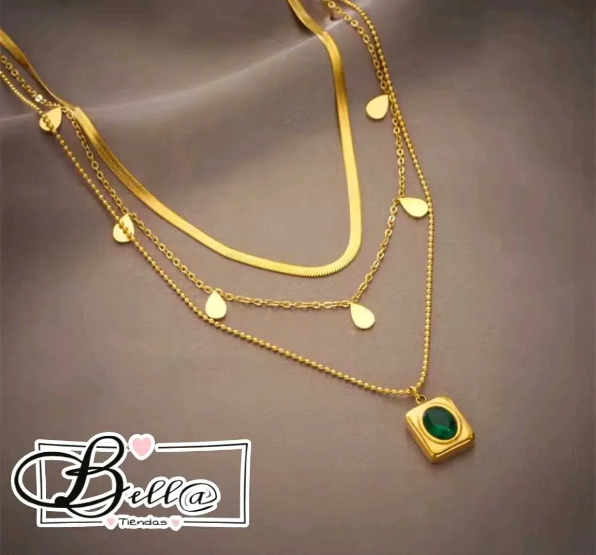 Collar Triple dije Cristal Ovalado Verde 💚