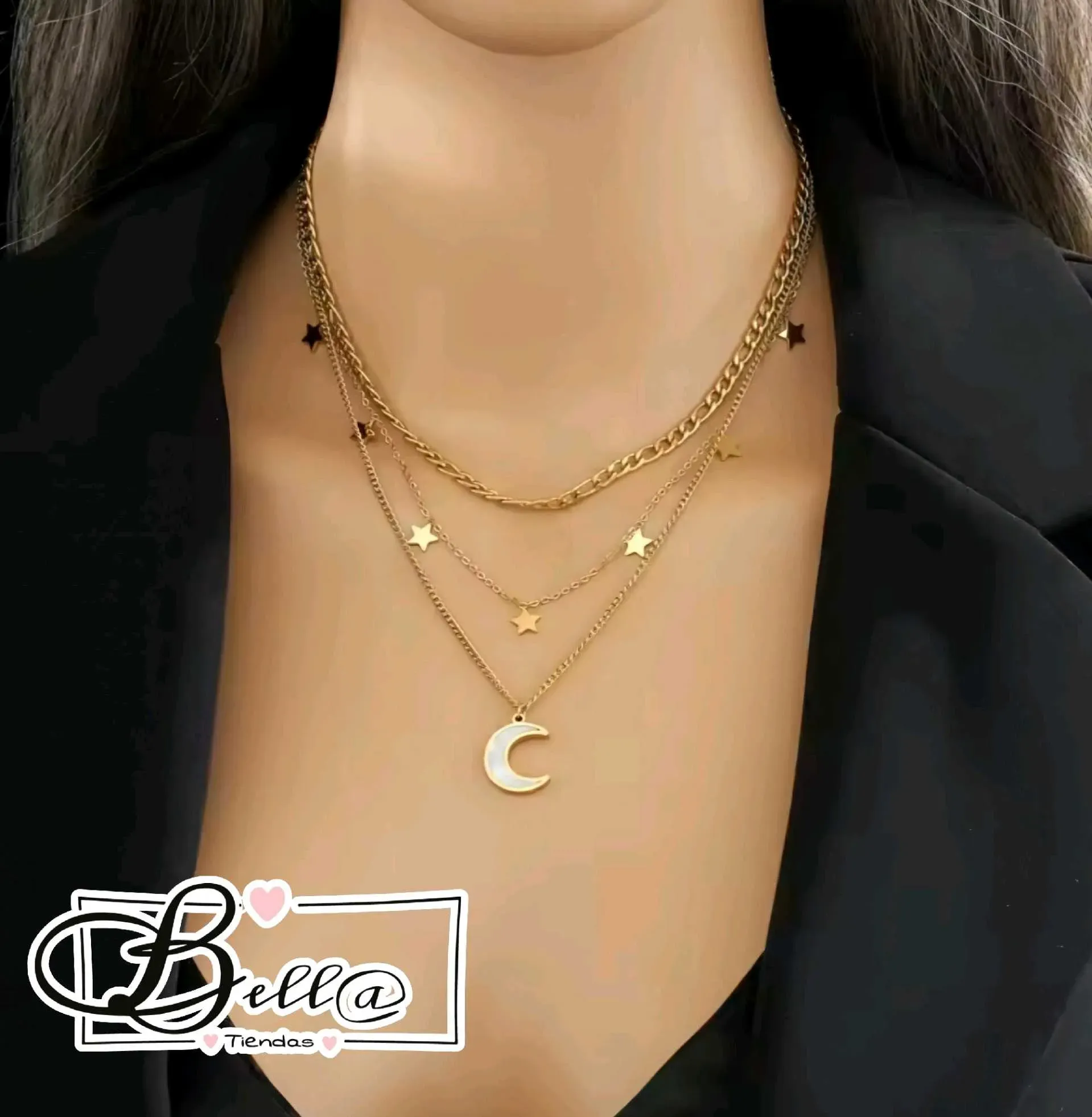 Collar Triple dijes de Estrellas y Luna Blanca 🌟🌛