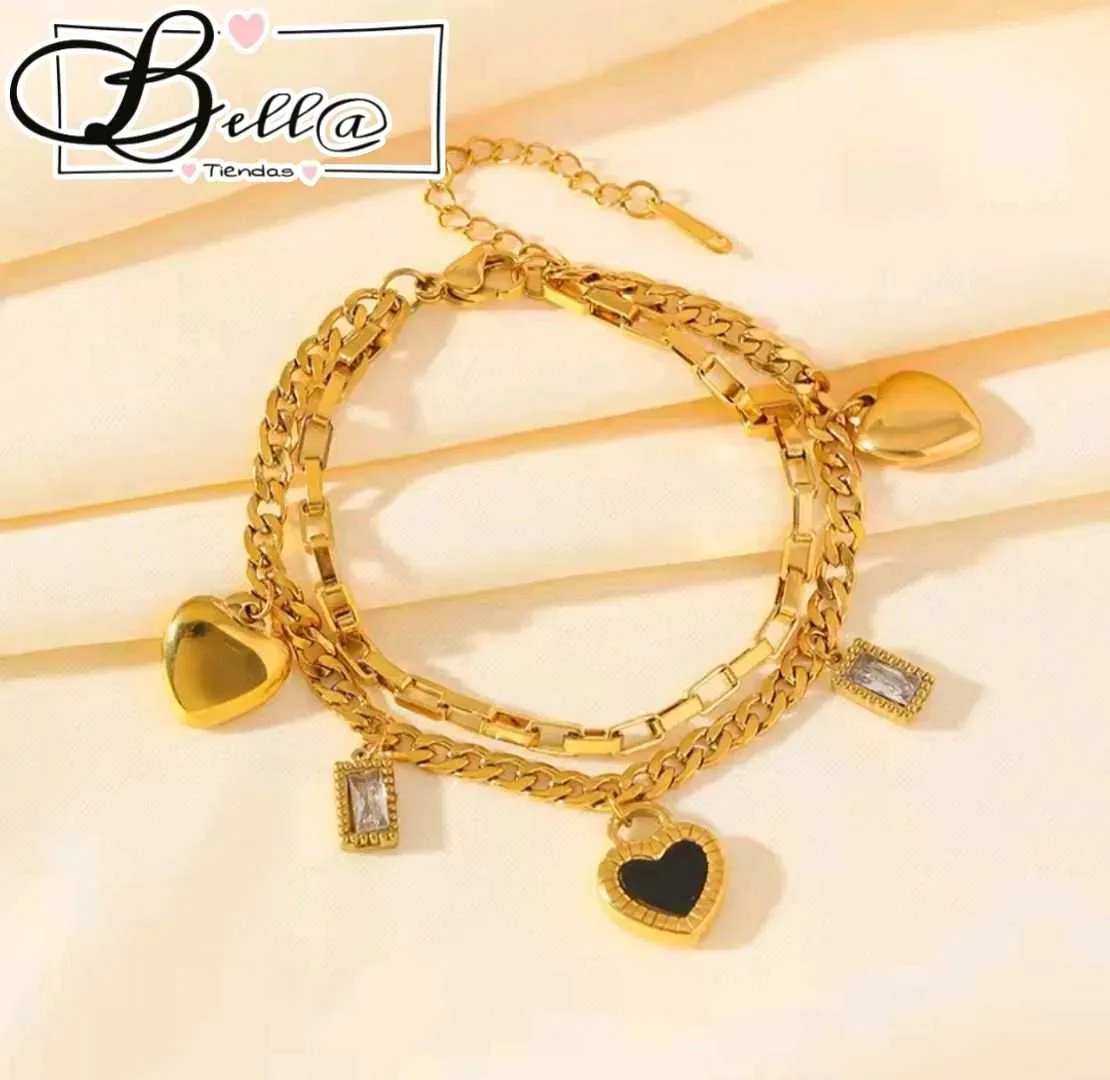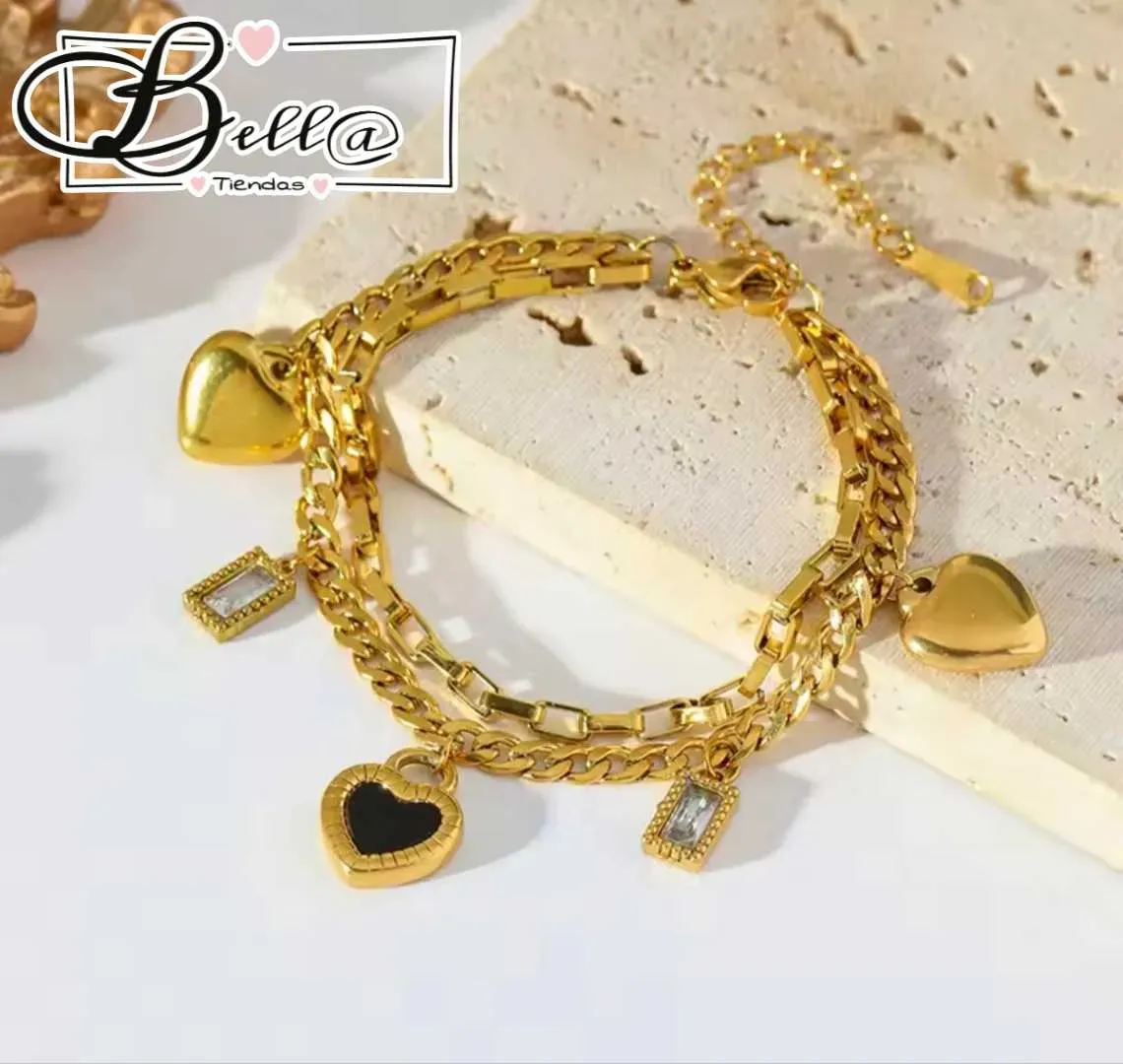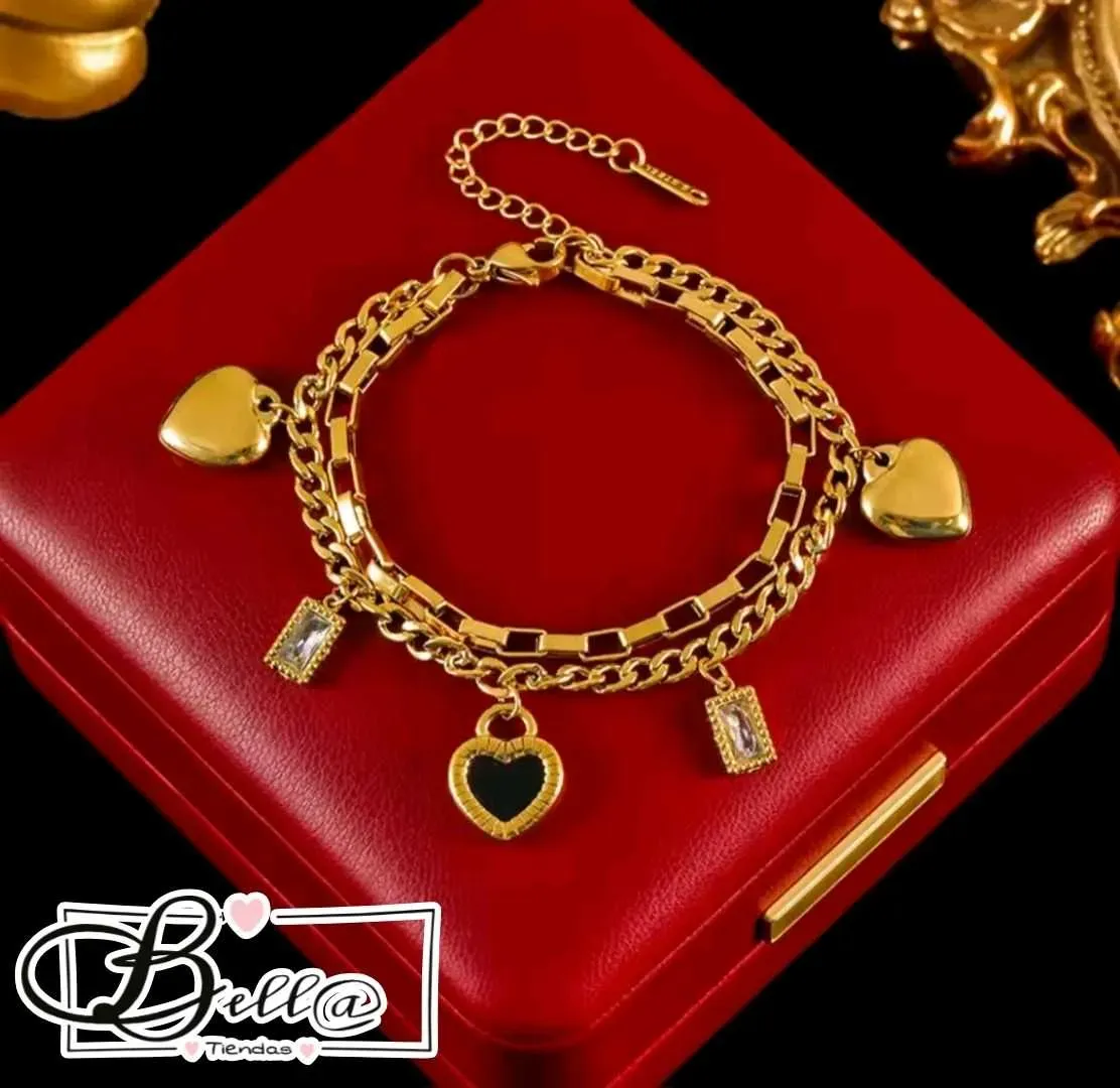 Pulsera Doble dijes Corazones y Pedrería 🖤💎✨️