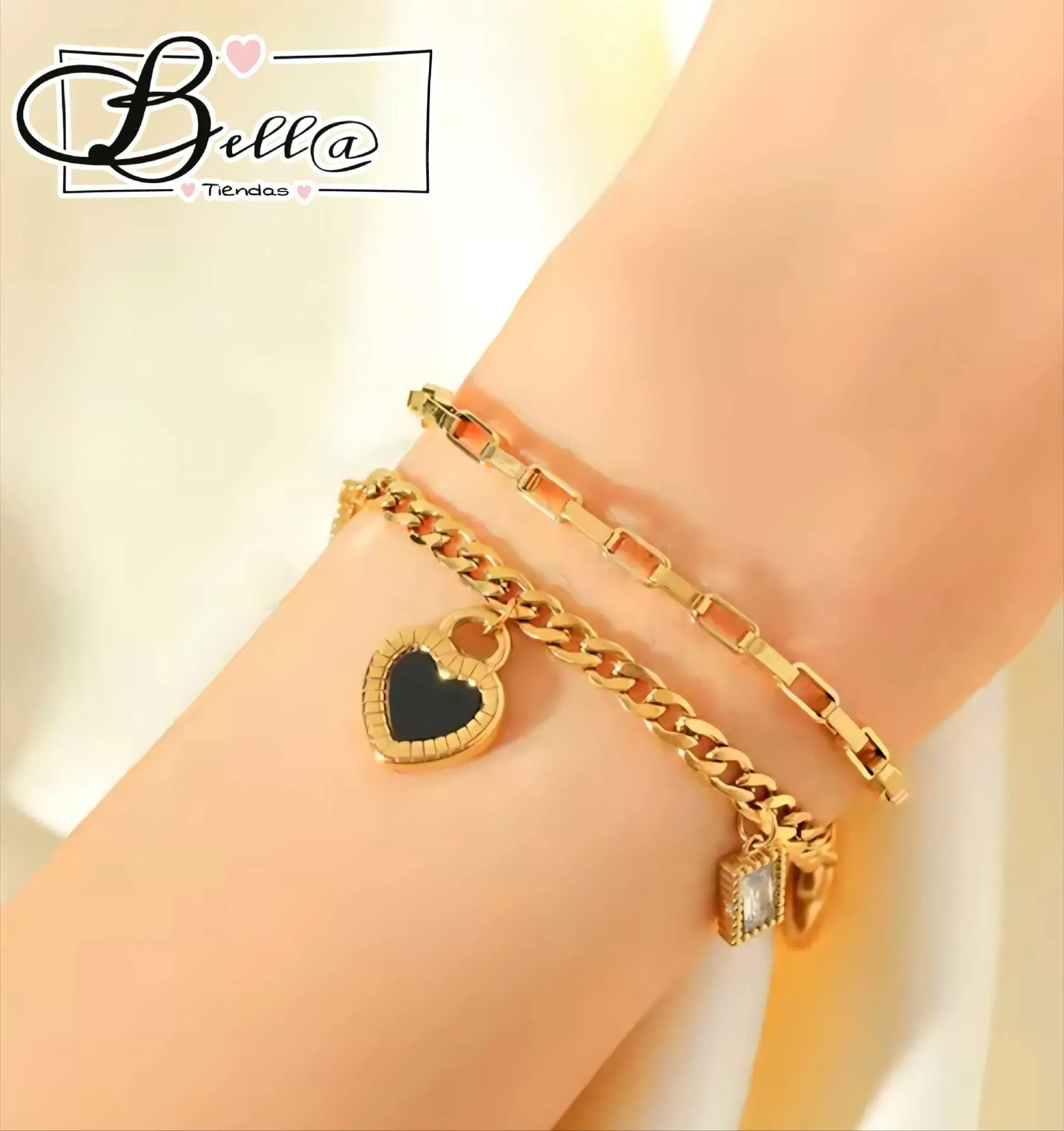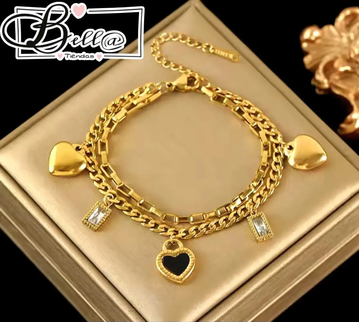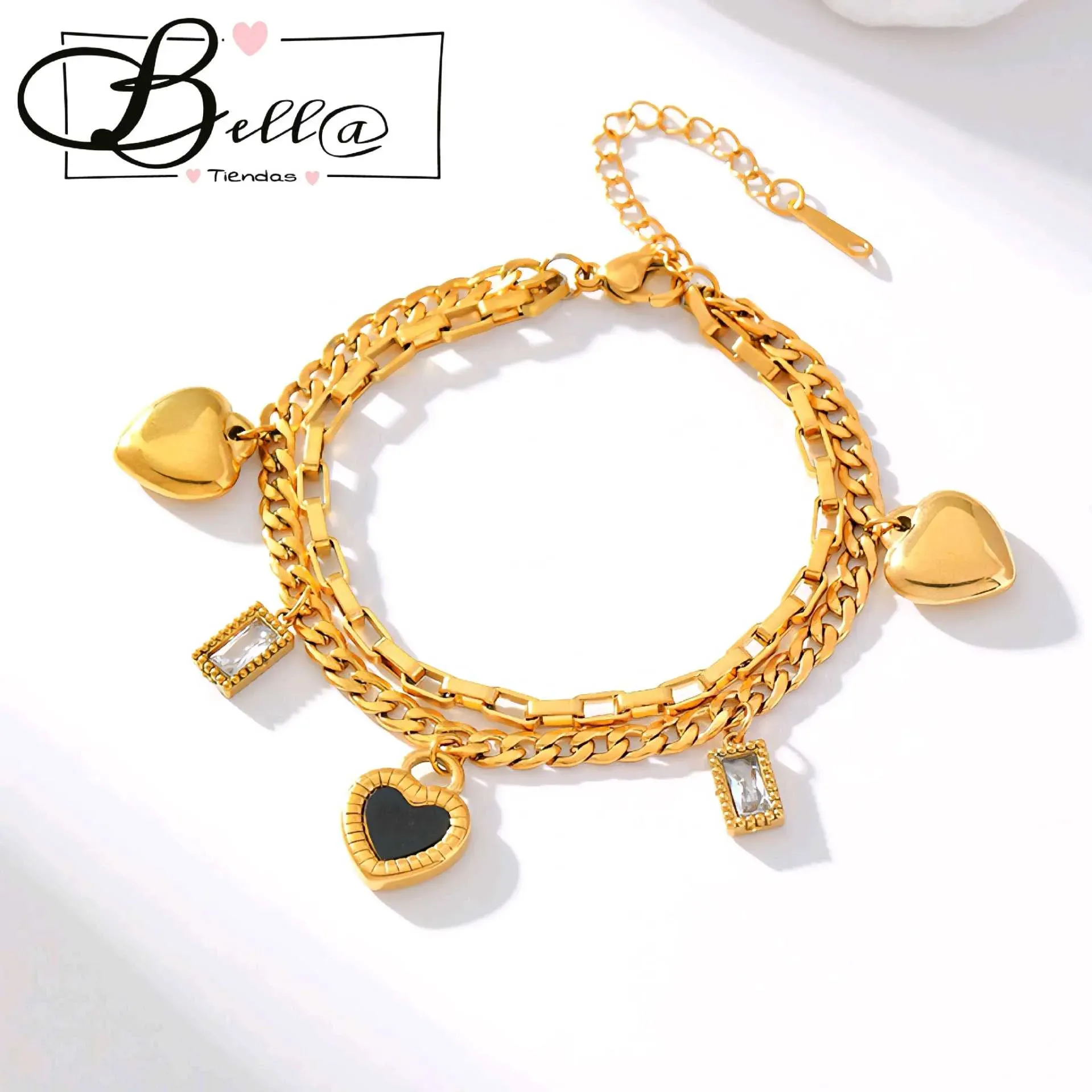 Pulsera Doble dijes Corazones y Pedrería 🖤💎✨️